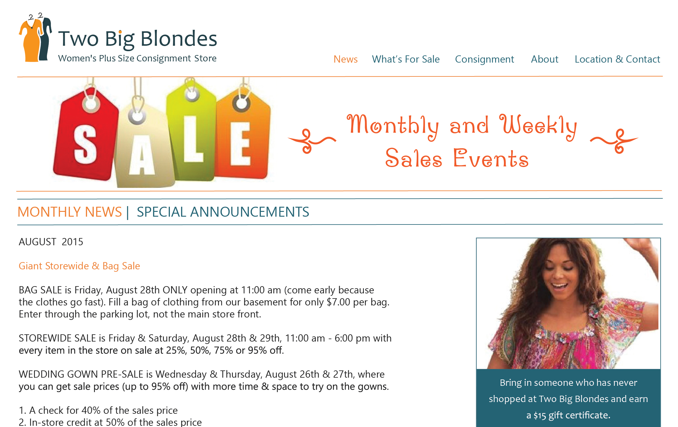 Two Big Blondes is a Women’s Plus Size Consignment Store located in the Central/Leschi area of Seattle. This store has very strong philosophy to make every customer happy by being a warm inviting place to shop and offering quality clothes at low prices. I wanted to redesign the website to preserve the atmosphere of the physical store and in addition to that give it a clean modern appearance to attract younger customers.